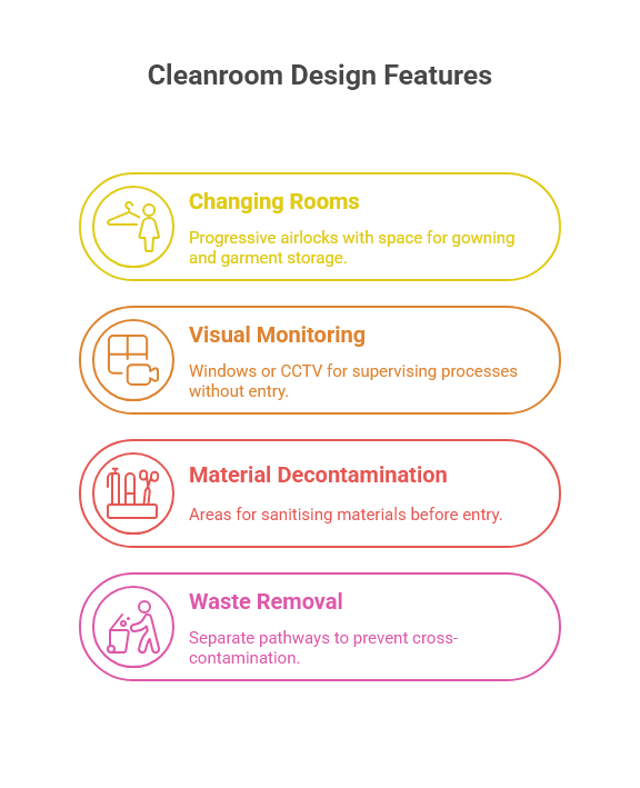 Visual monitoring: Windows or CCTV systems that allow supervision of critical processes without additional personnel entering the cleanroom.