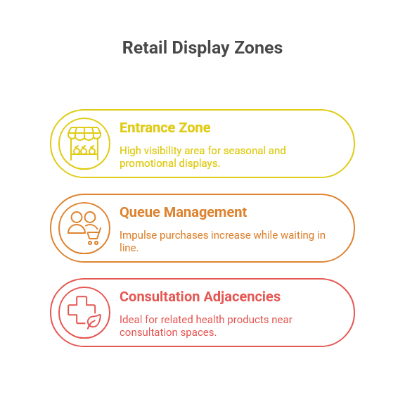 Counter adjacency: Products placed near prescription counters benefit from the dwell time as customers wait for prescriptions. The Pharmaceutical Society of Australia notes that these areas are ideal for professional recommendation products with higher margins (PSA, 2022).